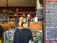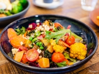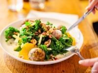 写真:Mayumi Iwasaki |  写真:Mayumi Iwasaki エンドウ豆とキヌアのコロッケ、ファラフェルが入ったサラダは食べ応え抜群($22.50 / ¥1,720) |  写真:Mayumi Iwasaki |