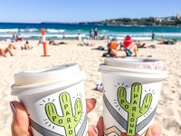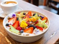 写真:Mayumi Iwasaki フルーツとシリアルがたっぷり入ったココナッツボウル($19.90 / ¥1,520) |  写真:Mayumi Iwasaki |  写真:Mayumi Iwasaki バナナの甘さとヨーグルトの爽やかな酸味が美味しい「banana yoghurt smoothie($10.00 / ¥760)」 |