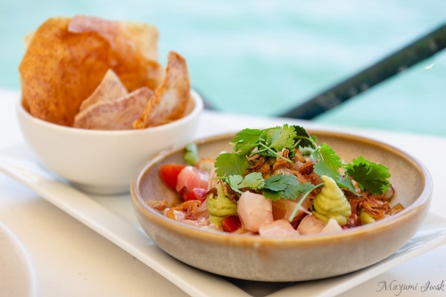 • 写真:Mayumi Iwasakiヒラマサの近縁種と言われる「キングフィッシュ」のセビーチェ($24.00 / ¥1,980)