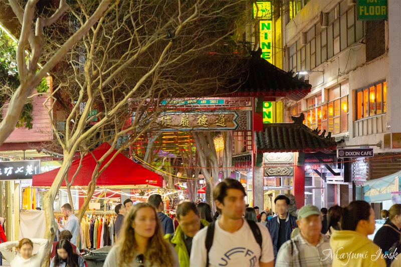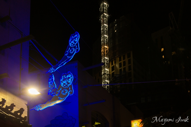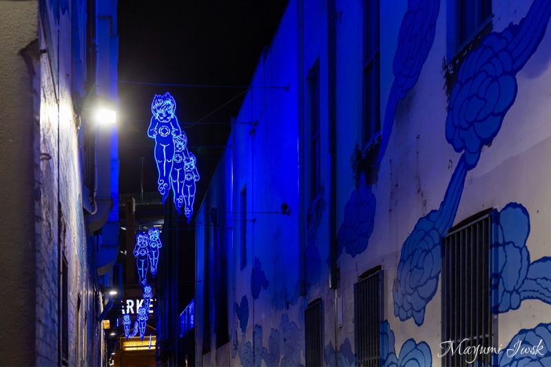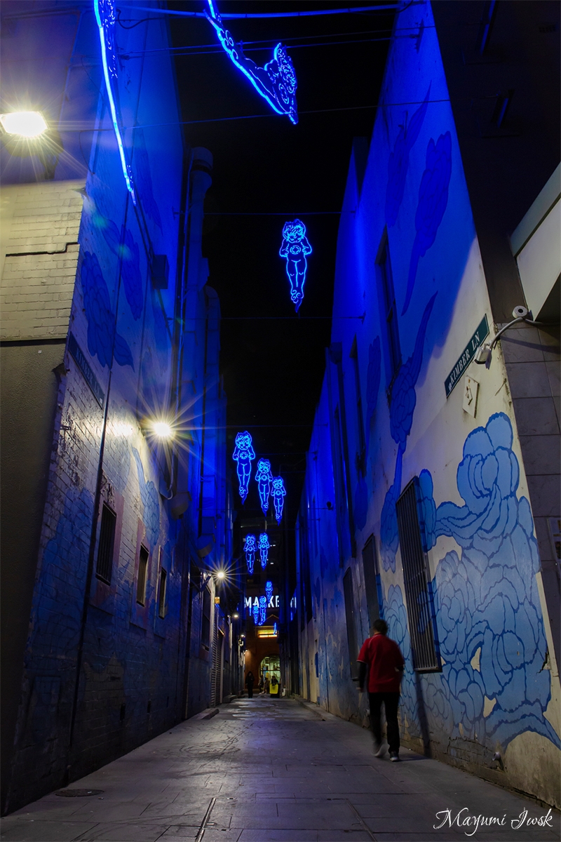 チャイナタウンのあるHay Market(ヘイ・マーケット)では、毎週金曜日になると活気のあるナイト・マーケットが開催されています。様々な露店が並ぶ活気あるナイト・マーケットですが、その外れに怪しい輝きを放つ路地があります。それがアーティストJason Wingによる「IN BETWEEN TWO WORLDS(イン・ビトゥイーン・トゥ・ワールズ)」です。