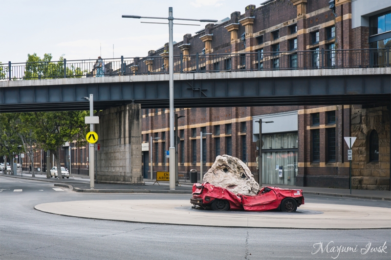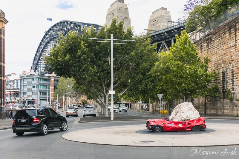 以前ご紹介したハーバーブリッジを臨むベイエリア「Walsh Bay(ウォルシュ・ベイ)」にあるのが、Jimmie Durhamによるインスタレーション「STILL LIFE WITH STONES(スティル・ライフ・ウィズ・ストーンズ)」です。Hickson Road(ヒクソン・ロード)沿いを歩いていると、ランナバウト中央に岩に潰された真っ赤な車が鎮座しています。