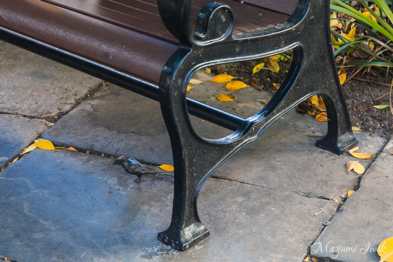 公園内にあるベンチの下にも、よく見ると数羽の小鳥が。