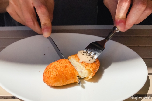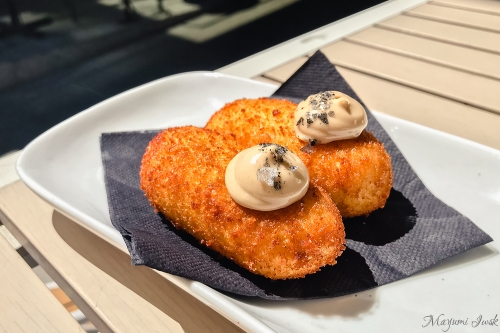 写真:Mayumi Iwasaki人気メニューのクリームコロッケ「CROQUETA DEL DÍA, AJO NEGRO MAYONESA($5.00 / ¥380)」)