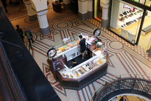建物の内装が本当に素敵で、とっても優雅な雰囲気です。柱や天井のドームやアーチ、階段の手すりなどのディテールが素晴らしく、フォトジェニックな場面がたくさんあります。長く続く建物の中心には吹き抜けの通路が通っていて、両脇には様々なテナントが軒を連ねています。