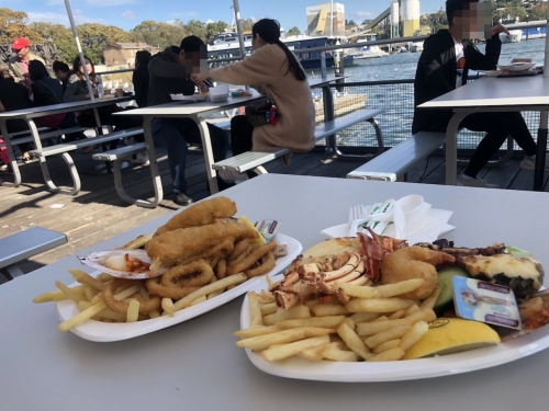 そしてシーフードプレートもおすすめです。マーケット内のいたるところで買えるシーフードプレートには、ボイルしたロブスターやカラマリ(イカリング)、オーストラリア名物のフィッシュ&チップスなどシーフードのボイルやフライなどがたっぷり盛り付けられています。