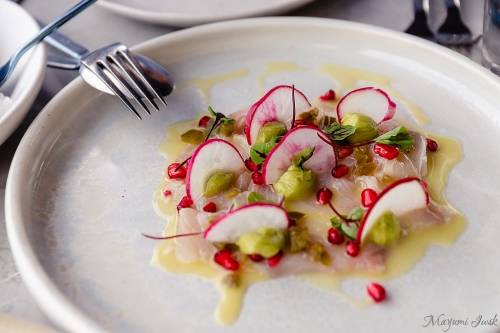 写真:Mayumi Iwasakiブリのような「キングフィッシュ(ヒラマサ)」のカルパッチョ($24.00 / ¥1,940)