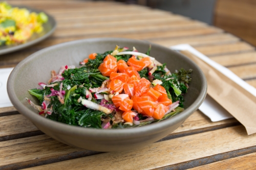 写真:Mayumi IwasakiORA KING SALMON POKE, PICKLED RED CABBAGE, ZUCCINI, KALE($16.50 / ¥1,420)