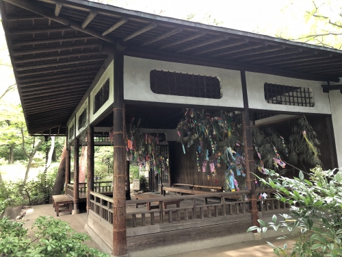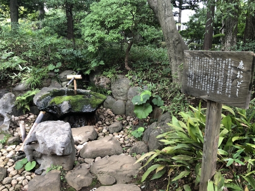 紅葉亭の脇には、井戸水を引いてつくられた鹿(しし)おどしがあります。僧都(そうず)とも呼ばれる鹿おどしは、竹筒に水が溜まると重みで傾き、水が流れ出て元に戻ると「カコーン」という音がなる仕掛けで、日本映画やドラマなどでも良く見かけます。本来はイノシシや鹿を追い払うためにつくられる仕掛けだった事が、鹿おどしと呼ばれる由来です。その風情ある音が響く近辺や紅葉亭は、園内でも風情を感じる和みスポットです。