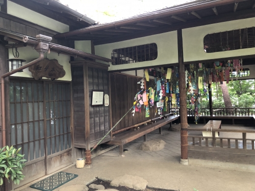• 写真:Noz鹿おどしから流れる水と小さな池の上にかかる橋。池では金魚が泳ぐ可愛いらしい様子がみれます。