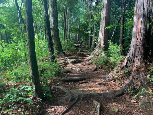 細かなアップダウンを繰り返しながら、木の根が張り巡らされた道や平な道をどんどん歩いていきます。