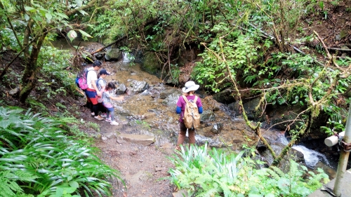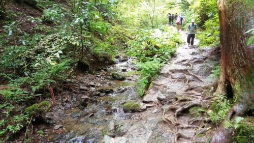 沢とはいえ、水量はさほどでもありません。飛び石が点々と置かれていますので、石の上をぴょんぴょんつたって歩けば、靴が濡れることもありません。大雨が降った直後でもない限り、飛び石が冠水することはないでしょう。しかし濡れた石は滑りやすいので、とくに小さなお子さんは気をつけてください。