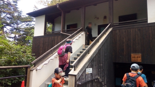 階段を上り終えると少し広くなった場所に出るので、「ここが山頂?」と思いがちですが、ゴールはもう少し先。最後の坂を上ると、山の上とは思えないきれいな建物が見えてきます。ビジターセンターかと思いきや、実はこちらはピカピカのトイレ。ウォシュレット完備の清潔なトイレがあることも、子連れ登山には安心材料ですね。