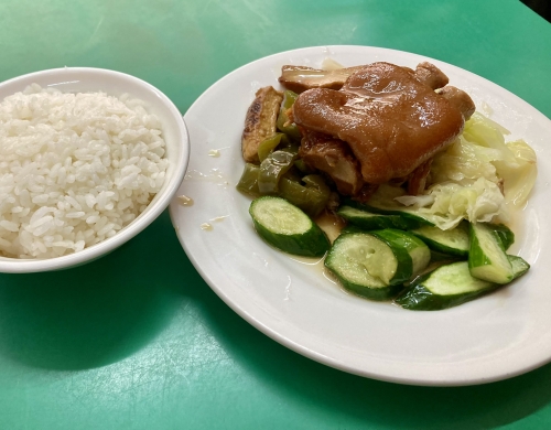 看板メニューは魯肉飯(ルーロウファン)ですが、豚足や鶏もも肉などのメイン料理+副菜がのった、定食メニューもおすすめです。魯肉飯は35元(約168円)、豚足定食は80元(約384円)。