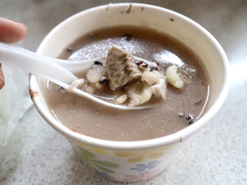 肉まんは、胡椒がピリッときいていておいしいっ。薬膳スープにはもつだけでなく、蓮の実やはと麦などの漢方の具材がゴロゴロと入っています。クセはあまり強くなく、飲むと力が湧いてくるようなスープです。肉まんは25元(約120円)で、薬膳スープは70元(約336円)です。