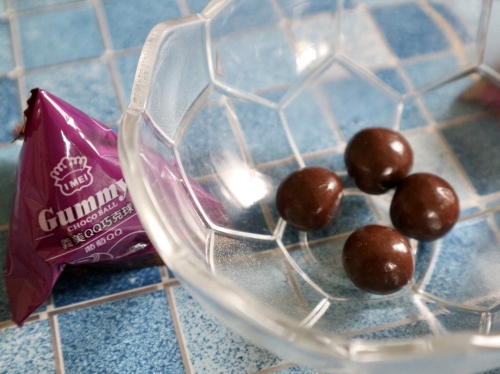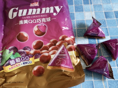 こちらはブドウ味のグミをチョコレートでコーティングしたお菓子です。もちもちしたグミの食感がクセになるおいしさです。