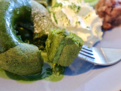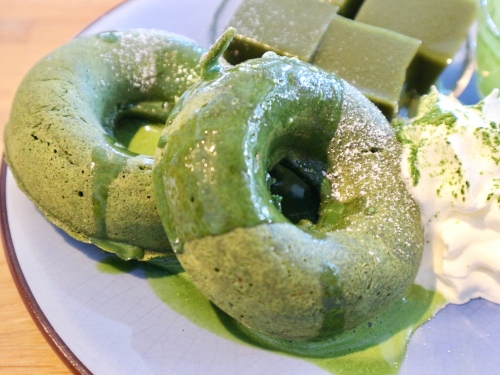 さっそく抹茶ソースをドーナツにかけていただきます。抹茶のドーナツは濃厚で、程よい甘さと抹茶の渋みがおいしいです。くずきりも抹茶の味をしっかりと感じます。