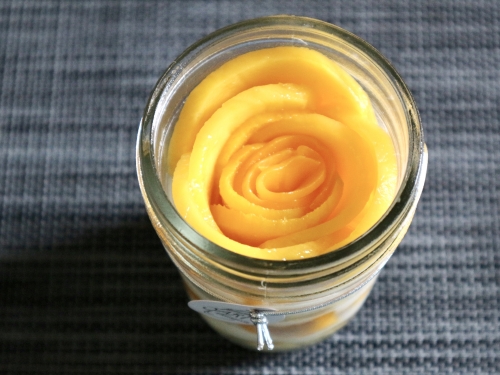 さっそく瓶のふたを開けてみると、マンゴーを使って象られた薔薇の花があらわれました。これはかわいい!