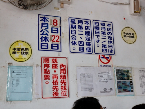 中国語や台湾語が飛び交う超ローカルなお店なのですが、実は日本人観光客も多く訪れるようで、店内には日本語で定休日の案内などが書かれています。