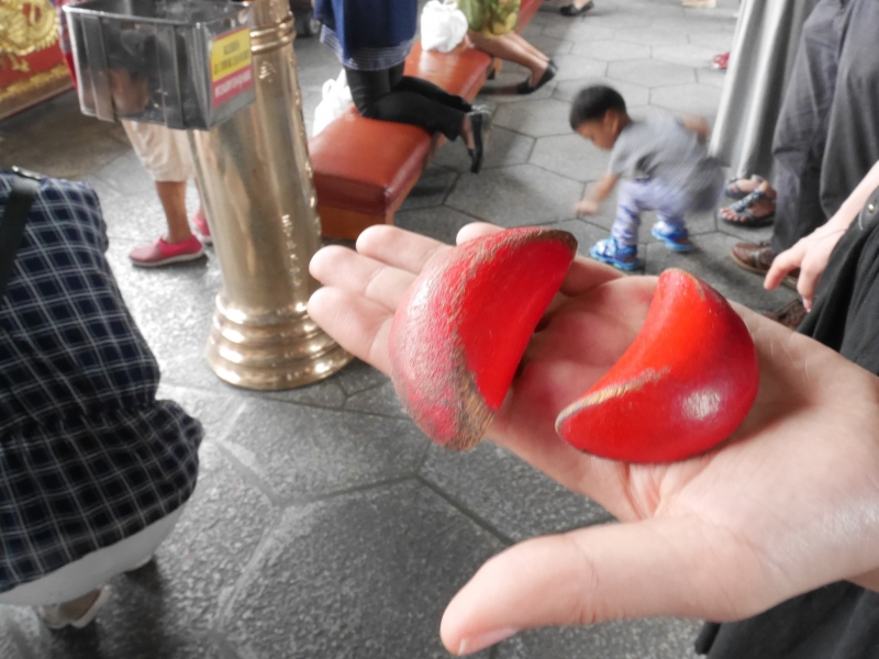 龍山寺では是非おみくじを引いてみてください。台湾のお寺ではおみくじの引き方が日本とは違って、三日月型のおみくじ(筊杯)を地面に落とし、これを聖杯(裏と表)が出るまで繰り返す、など手順がやや複雑です。
