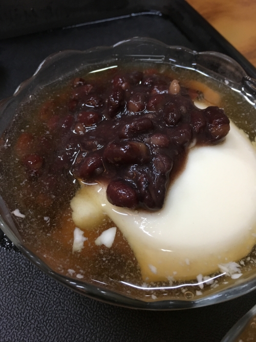 一つ目(写真左)は、小豆トッピング。舌触りが柔らかく、煮豆の歯ごたえと合わさって、上品な味わいでした。煮豆の周りには黒糖のシロップがかけられており、コクのある香りです。