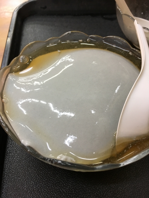 三つ目(写真左)は、竹炭味です。竹炭が混じっているので、見た目が灰色になっています。トッピングは無しで注文をしてみました。味は白いお豆腐と比べて、そこまで変化はなく、食べやすかったです。甘いものが苦手な方向け。
