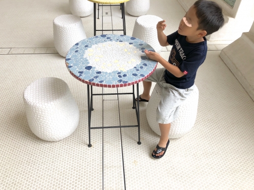 小さなお子様連れの方に嬉しいのは、モザイクタイルは一般的な木工用ボンドで貼り付けられるので、子供が好きなように創作できる、ということ。ちょっとくらい、手がベタベタになっても大丈夫です。