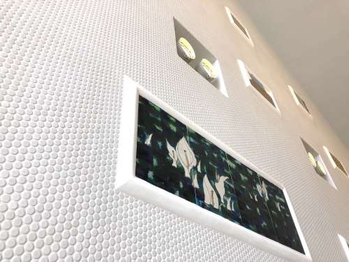 近くに寄って観ることも触ることもできます。雨ざらしになるような場所にあって大丈夫?!と思うかもしれませんが「タイルは雨にも風にも日光にも強い!」というメッセージを込めて、あえてこういう半屋外に展示してあるとか。