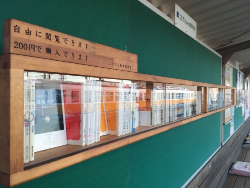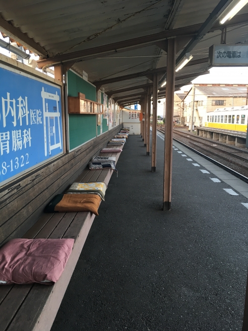 仏生山の駅の待合ベンチには、丁寧に座布団が置かれていたりと、温かさを感じます。写真に収めるととってもキュートに映ります。そして、なんとプラットホームに本棚が!ユニークな仕掛けですね。