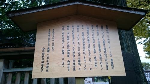 境内に入ると最初、右手にご鎮座するのが白川神社です。世界遺産にも登録されている合掌造りの里、白川村の一部は、御母衣(みほろ)ダムの湖底に沈んだため、村の産土神(うぶすながみ)である白山神社が土地を無くしました。氏子たちも散り散りに離散する中で当地に遷座し、氏子たちの心のより処となったということです。