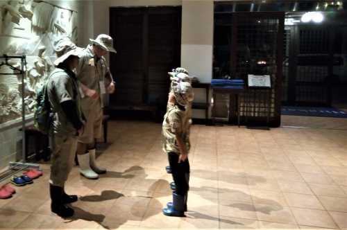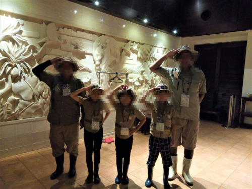 子どもたちが親から離れ、“隊長”や初対面のお友達と一緒に、ホテルの敷地内で夜の探検にでかけるというプログラム。冒険大好きで好奇心旺盛な、子ども心をくすぐる内容です。本格的なサファリルックに着替えて、子どもたちはやる気満々!サファリハットにヘッドランプをつけ、点呼を取ったら出発です。