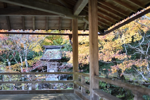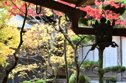 中庭の先では、本殿奥の庭園を眺めることができます。庭園といっても巨大なものではないのですが、渡り廊下や中庭、お堂など、慧日寺の建造物そのものと一体化した紅葉見学が楽しめます。のんびりと歩きながらの紅葉めぐりは、視点が変えながら様々な景色に出会えるので退屈しません。