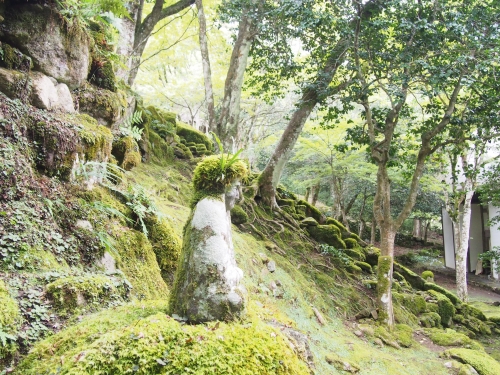 石段も道も苔で覆われていて、石像の頭にも苔の帽子。空気清浄や癒し効果がある苔ですが、まだまだ謎を秘めている植物でもあります。こちらのお寺でも苔の多い場所では、たしかに清涼感を感じることができますよ。