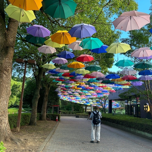 館林市役所敷地内の歩道約30メートルにわたって、市民有志の方々が300本の傘を吊るし、カラフルで幻想的な光景を作り上げています。色とりどりの傘を見上げ、前向きな気分で楽しんでほしいという願が込められているのだそう。夜にはライトアップが施され、昼間とはまた異なる幻想的な光景が広がります。