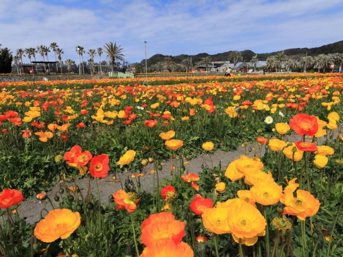 春には7,500㎡の広大な花畑に10万株100万本のアイスランドポピーが元気に花を咲かせ、3月上旬〜4月中旬にかけて見頃を迎えます。ポピーは見るだけでなく、有料で花摘みをすることも可能。ポピー以外にも花摘みができる花があるので、興味のある方は公式サイトで確認しておでかけくださいね。園内にはパターゴルフ場や手作り体験ができる施設も。