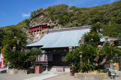 船形山の中腹に舞台造りの朱色の観音堂が張り付くように建っており、遠くからでも目につきます。観音堂へは思いのほか気軽に訪れることができ、館山の街並みや海を見晴らす素晴らしい眺望を楽しむことができます。観音堂の114枚の天井絵も見どころです。