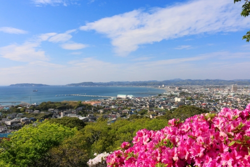 かつて戦国武将の里見氏の居城が置かれていた地。園内には、桜や梅、松、楓など万葉集に詠まれた植物を中心に多くの植物が植えられ、ツツジの名所としても知られています。頂上にたつ天守閣(有料)は館山市立博物館の分館になっており、天守からは館山湾や館山市街を一望する素晴らしい景色を楽しむことができます。