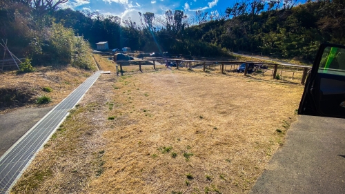 こちらも同様に芝サイト。奥に見える囲いのあるサイトは、ワンちゃんもOKの芝サイトです。みなさんリードからワンちゃんを解放して、家族全員でキャンプを楽しまれていました。