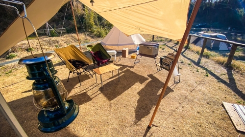 筆者は芝サイトに宿泊をしました。4名が収まるサイズのテント1張と、タープ一つでも窮屈感はなく、ちょうど良い広さ。各サイトは段々になっていて高低差があるので、プライベート感もありました。芝サイトにおいても車の横付けは可能なので、荷物の多いキャンパーも安心です。