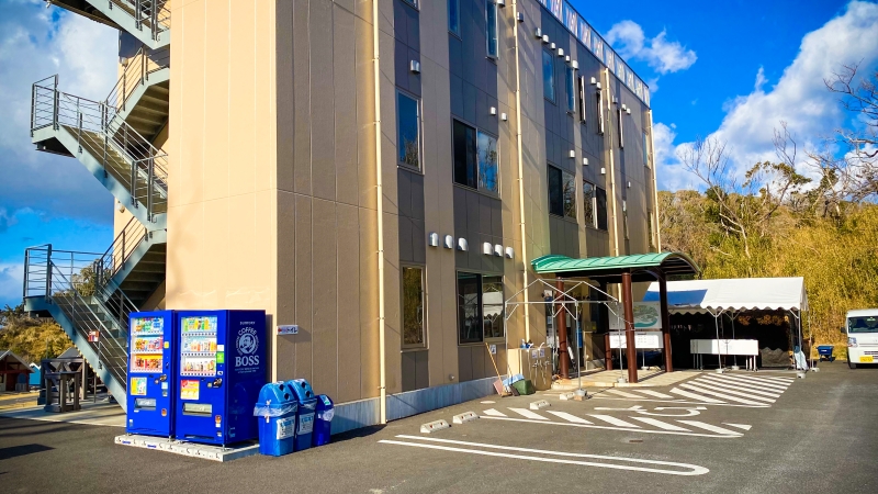 キャンプマナビスのアイコンとなっているセンターハウス。3階建てのビルには、温泉(宿泊者は無料利用可)のほか、売店や研修ルームまで、さまざまな設備が。