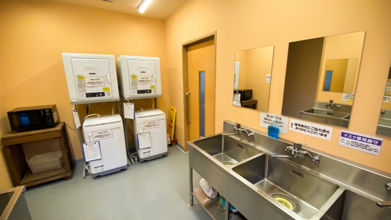 上記に加え、管理棟であるセンターハウスには、炊事場とランドリーが。洗濯機と乾燥機はなんと無料で使用できるので、ちょっとした汚れが服に着いてしまったときにも気軽に洗濯できるのが嬉しいポイント。
