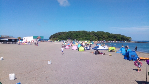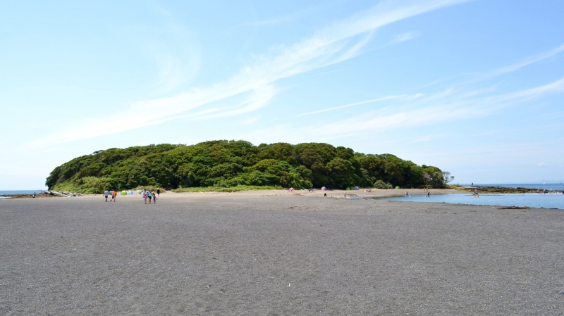 その不思議な地形は、航空写真だととても分かりやすいです。陸続きの沖ノ島もかつては四方を海に囲まれたまぎれもない“島”でしたが、大正時代の関東大震災によって地底が隆起し、海中に砂がたまって現在の姿になったそう。その砂地部分が、今では大勢の人出でにぎわう「沖ノ島海水浴場」になっています。