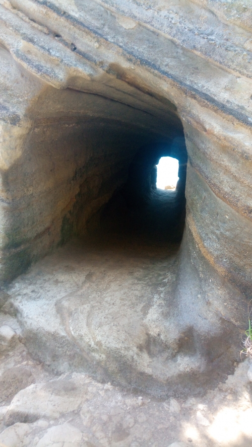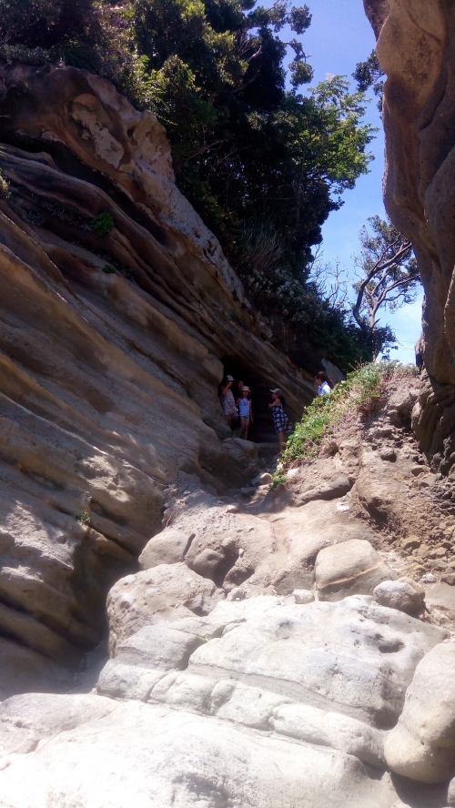 ゴツゴツとした岩場を行くと、今度は登り返しが。写真で見るとかなりな大冒険のようですが、実際は幼稚園児でも登れるくらいです。波で岩場が濡れている場合もあるため、油断せず慎重に登りましょう。そしてついに、洞窟の入口を発見!(とはいえ、ここまで島の入口から10分たらずですが)