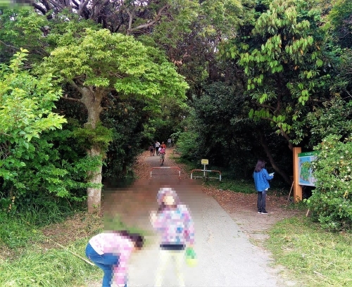 木々が生い茂る整備された道を、ずんずん進みましょう。すぐに簡易トイレがある広場に到着します。このトイレは島内唯一のトイレ及び水道ですので、万が一の時に場所を覚えておくと便利です(島の手前には簡易トイレあり)。広場のあずまやで、お弁当を食べている人もいます。