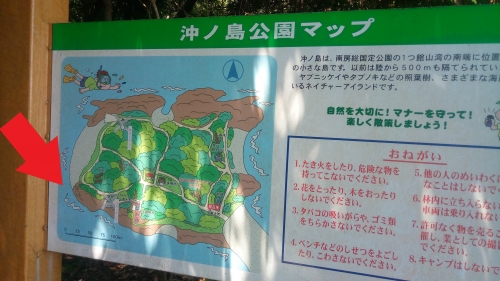 洞窟探検のスタートは、島内の入口看板から。陸側からまっすぐ正面が島への入口で、大きなイラストマップ入りの看板が立っています。過去にあったものの今は閉鎖されている設備もあり、「撤去しました」と書かれているので注意。洞窟の場所は地図上には明記されていませんが、手書きの文字で「どうくつ」と書かれている矢印のあたりです。