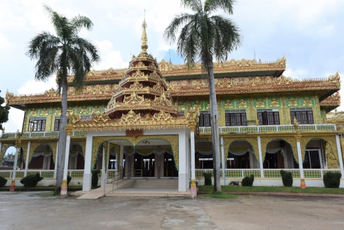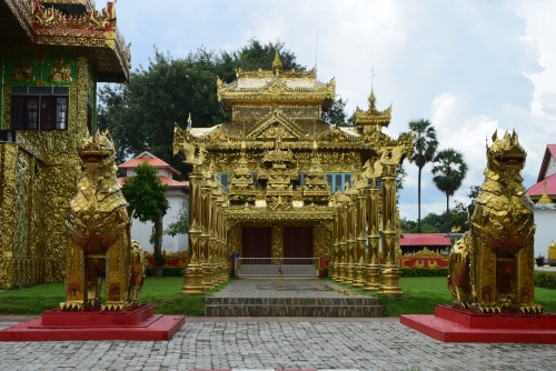 ミャンマースタイルの金ぴかな建物が特徴的なお寺です。タイでは金色と白色で彩られたお寺が多いのですが、こちらは金色の間が赤や緑で彩られていて、タイのお寺よりも深みのある色合いに感じます。