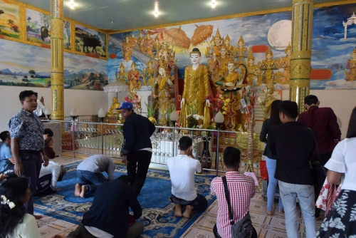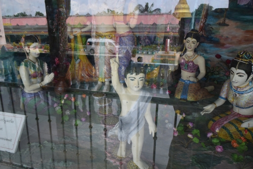後ろの建物には、仏陀の生涯がレプリカで展示されています。多くのミャンマー人観光客が訪れる、格式あるお寺のようです。