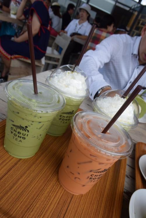 タイ北部とはいえとても暑いので、冷たいドリンクやフラッペが人気です。オレンジ色の飲み物はタイのミルクティーです。はじめはその色に驚きますが、とても香りのよい甘いミルクティーで、タイを訪れたらぜひ試してほしいドリンクの一つです。