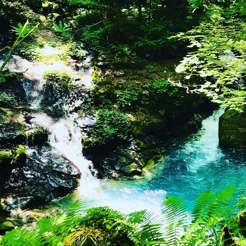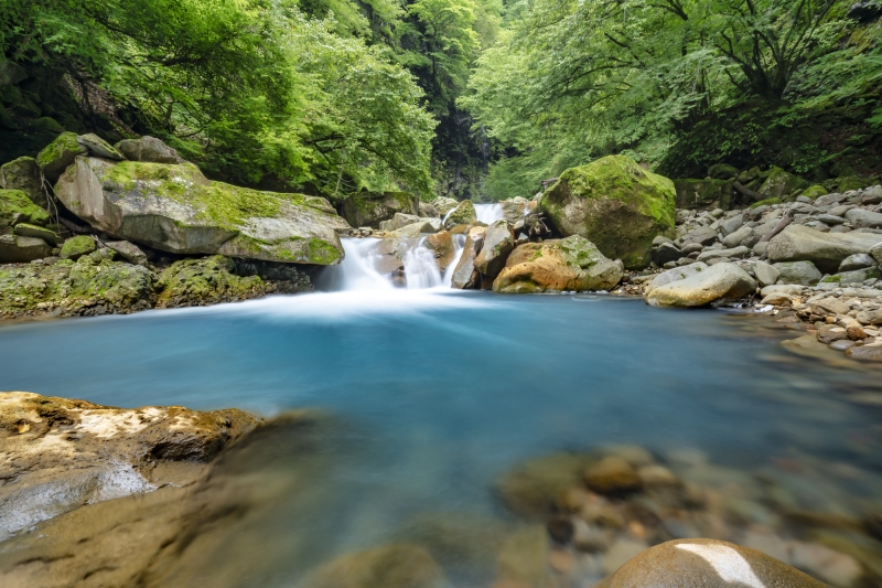 那須塩原で随一の渓谷美を誇る秘境「スッカン沢」。流れる水は場所によって青白くみえ、スッカンブルーと呼ばれています。青白く見える理由は、高原山のカルデラ跡を水源とし、鉱物や炭酸等の火山の成分が多く含まれる水が流れているためで、この水が辛くて飲めないことから「酢辛い沢」と呼ばれていたことが名前の由来です。