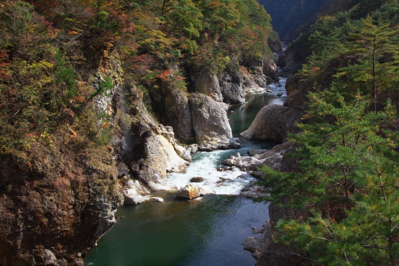 川治温泉と鬼怒川温泉の間、約3kmに渡ってつづく景勝地。今から2200万年も昔の海底火山の活動によって噴出した火山岩が、鬼怒川の流れによって侵食され現在のような景観を生み出したと言われています。周辺には1〜3時間程度の散策を楽しめるハイキングコースがいくつかあり、「虹見の滝」や「かめ穴」など見どころもたくさん!