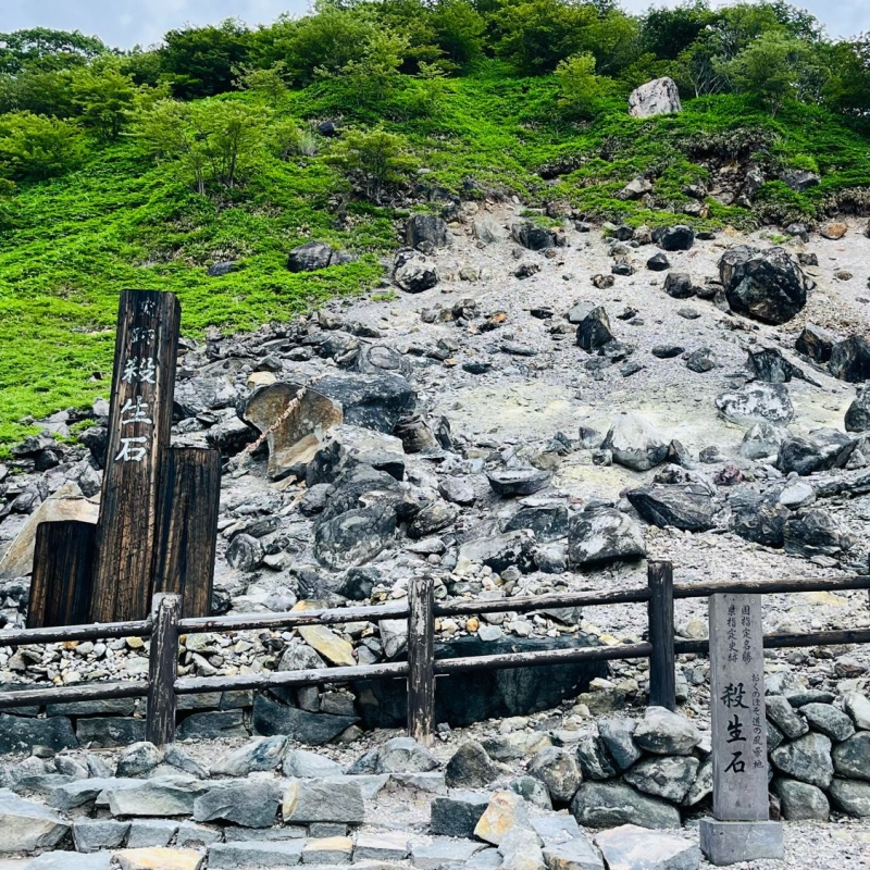 松尾芭蕉の「奥の細道」にも登場する那須を代表する観光名所。付近一帯では亜硫酸ガスなどの有毒ガスが絶えず噴出しており、鳥獣が近づけば命を奪う殺生の石として古くから知られています。